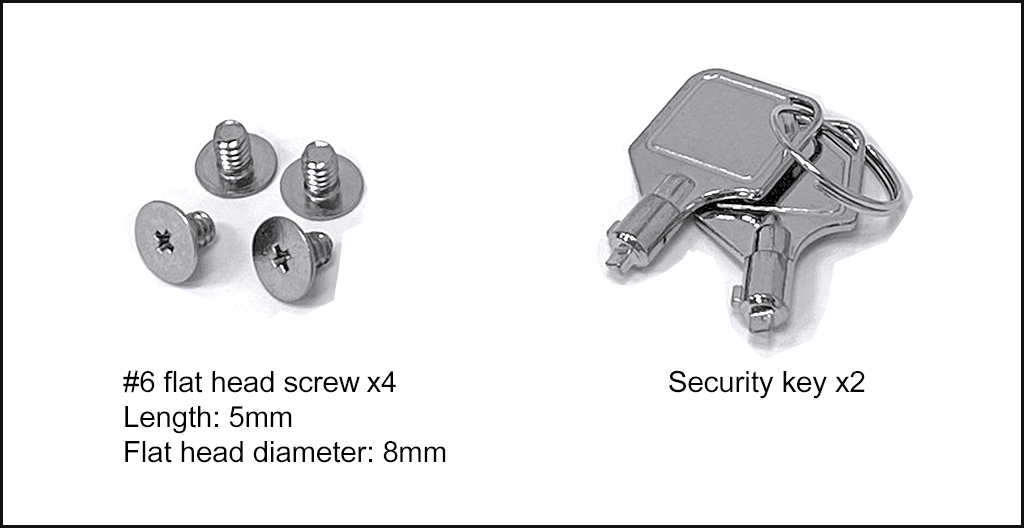 * 零件包明细: M3平头镀镍螺丝x4pcs, #6平头镀镍螺丝x4pcs, 保密安全钥匙x2pcs